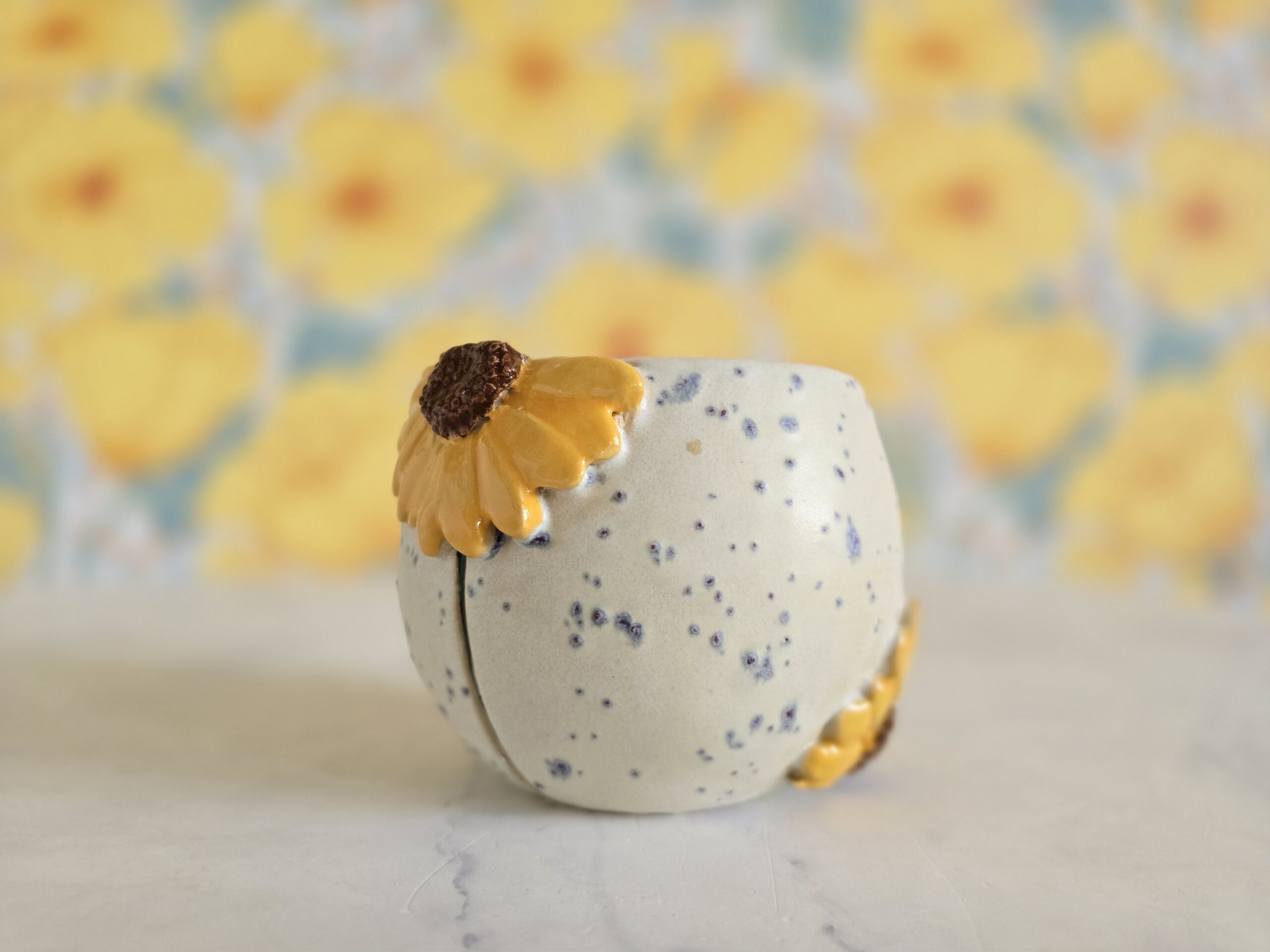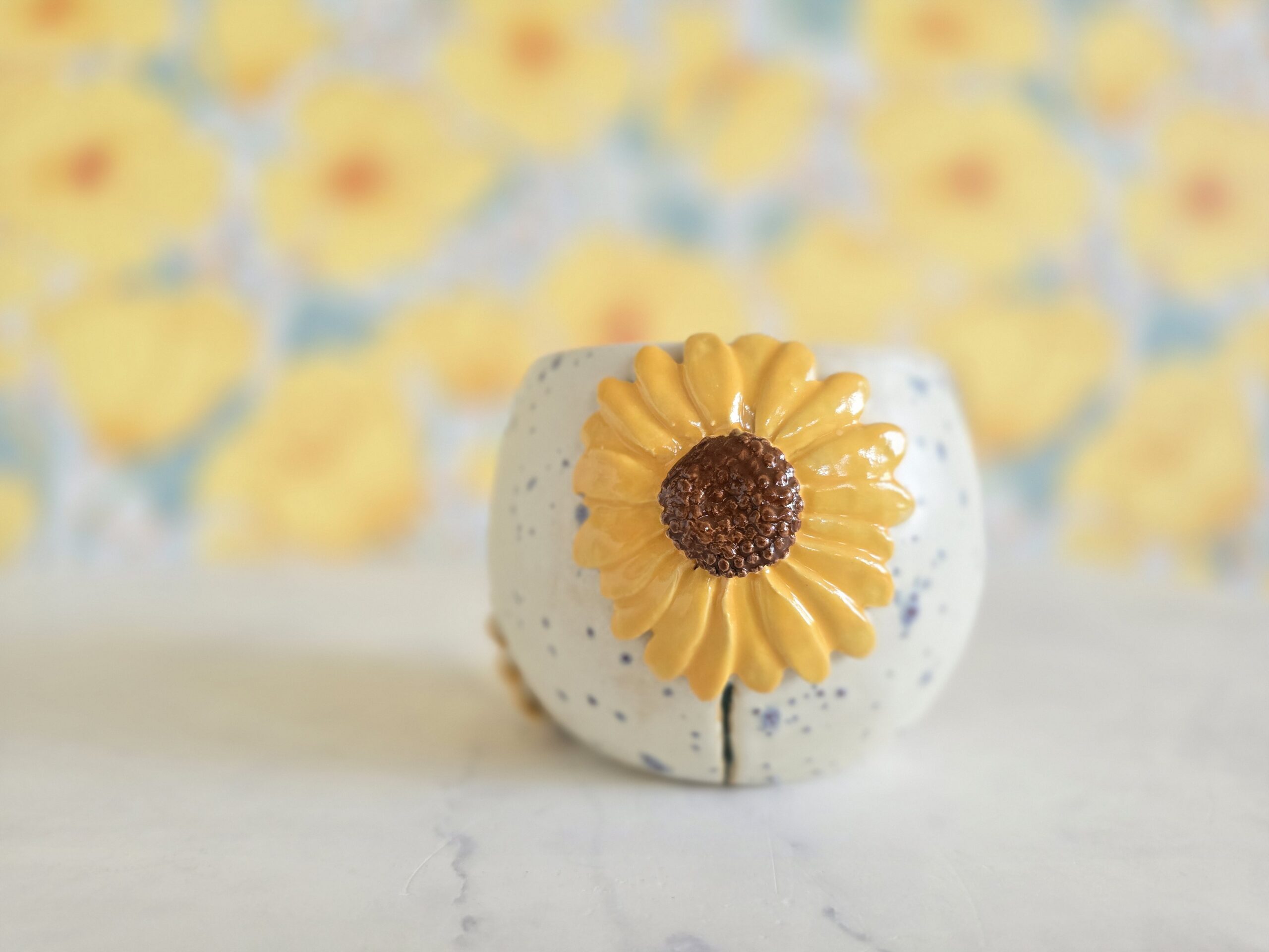 Koppen har en blød, rund form, der ligger behageligt i hånden og giver en hyggelig, organisk fornemmelse. Den er dekoreret med håndmodellerede solsikker i relief, som tilfører struktur og liv til overfladen.