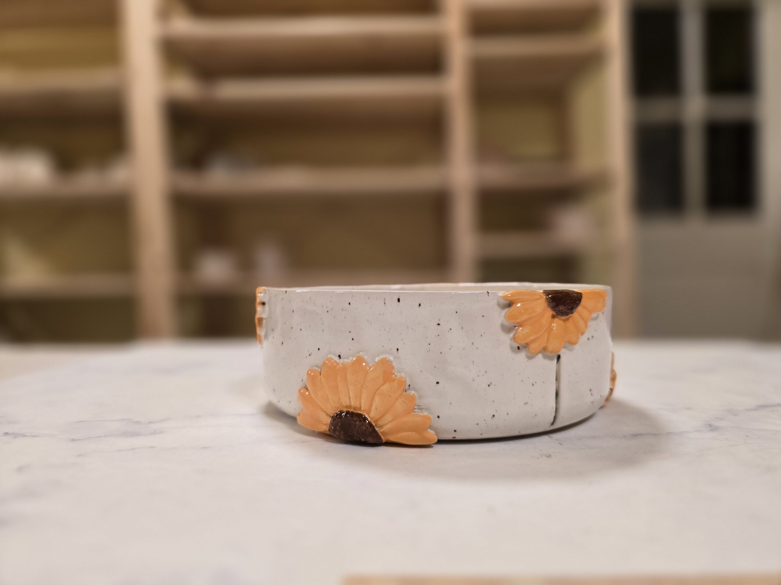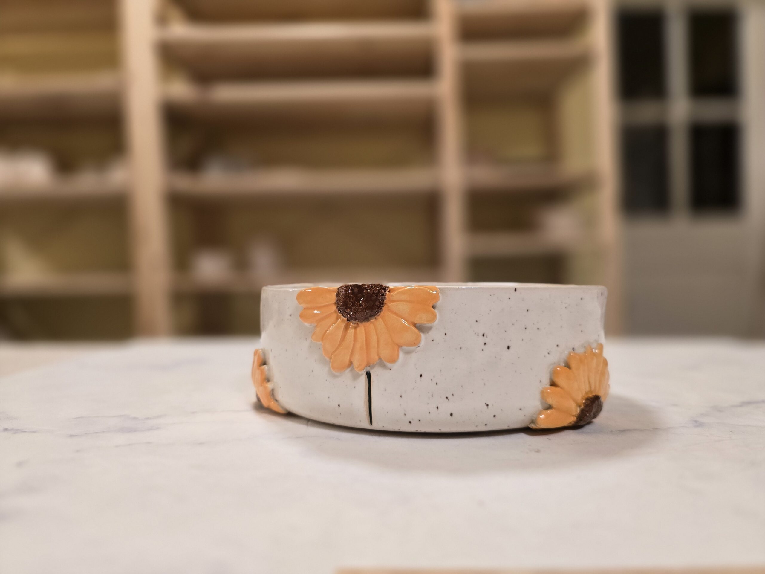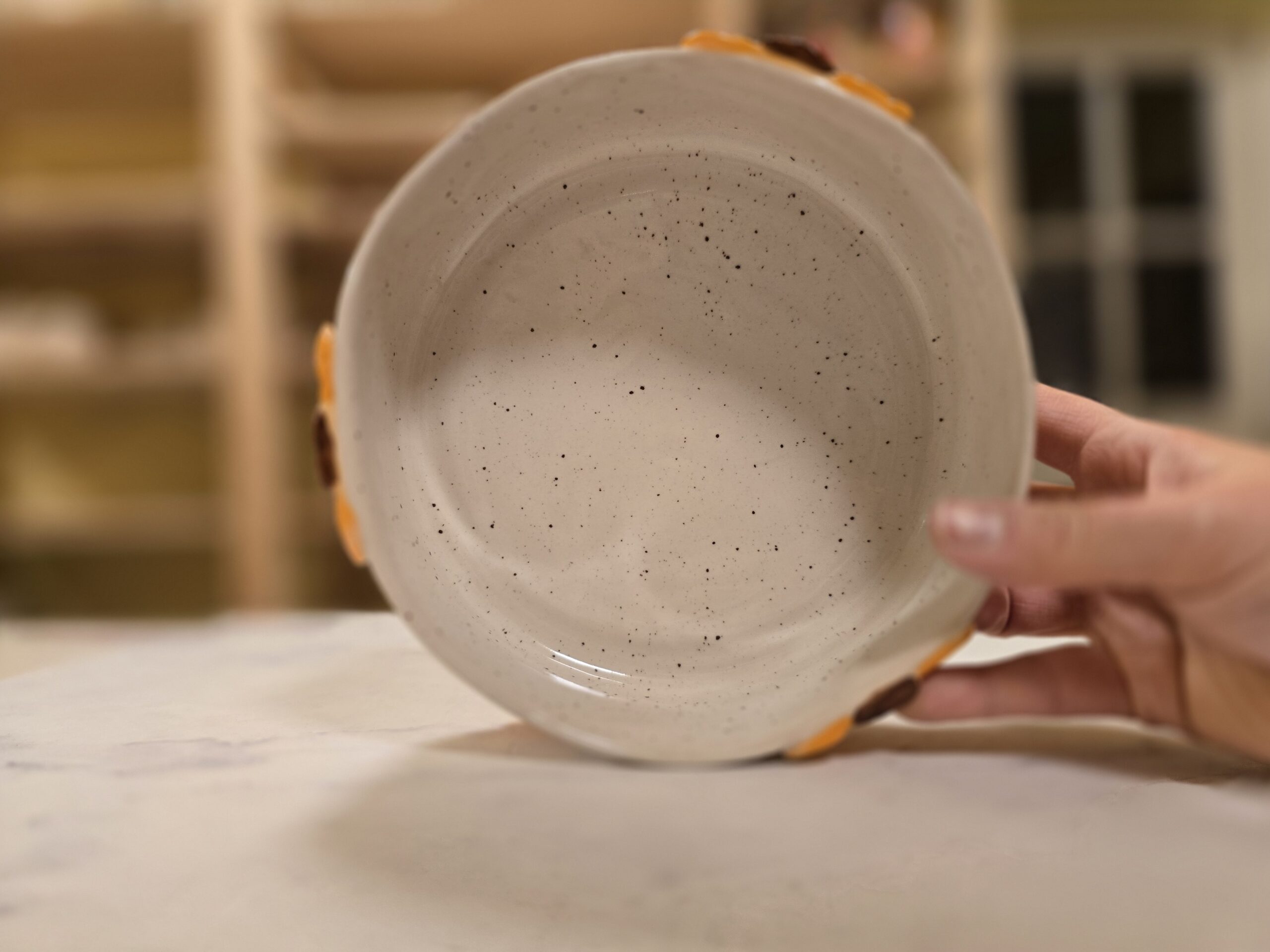 Skålen er udført i stentøj med en sandfarvet glasur og fine mørke prikker, der tilfører dybde og karakter. De varme orange solsikker med mørke centre skaber en smuk kontrast mod den lyse bund og giver skålen liv uden at virke overdekoreret.