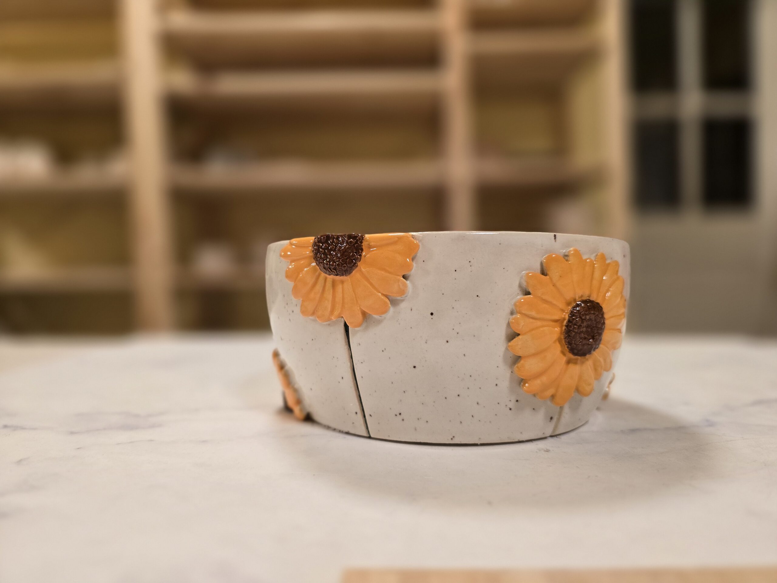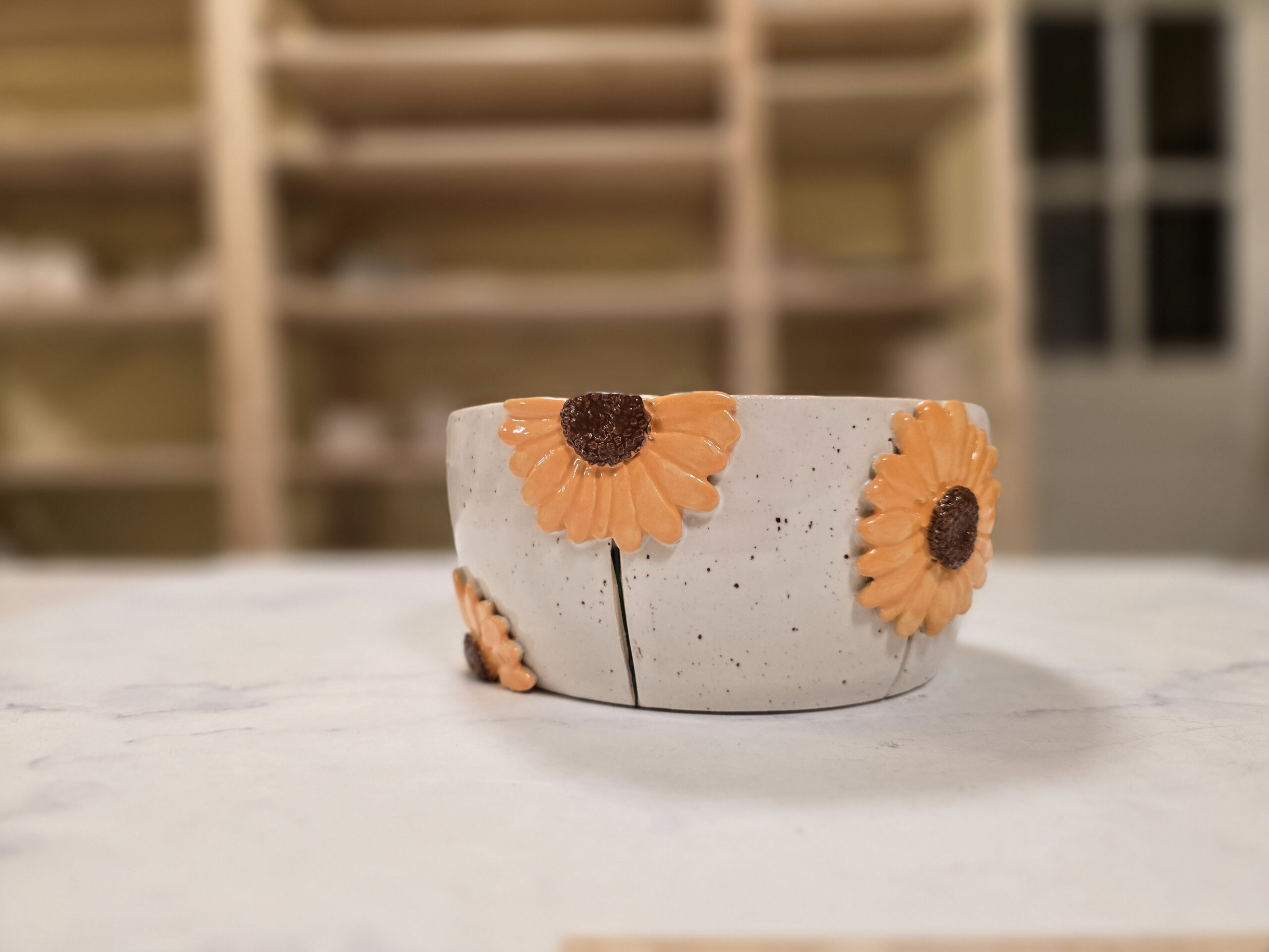 Rundt om skålen blomstrer solsikker i varme orange nuancer med mørke centre – et motiv, der skaber kontrast og karakter uden at virke tungt. Der er god luft mellem blomsterne, hvilket giver skålen et mere enkelt og harmonisk udtryk.