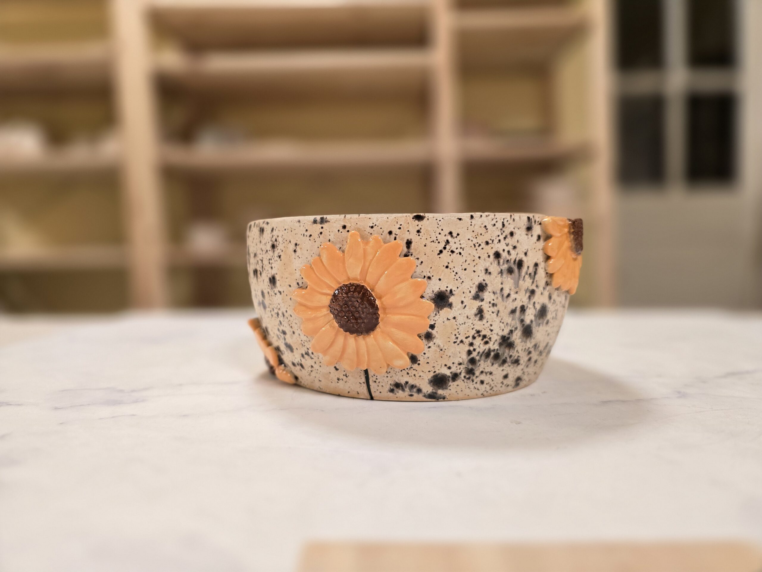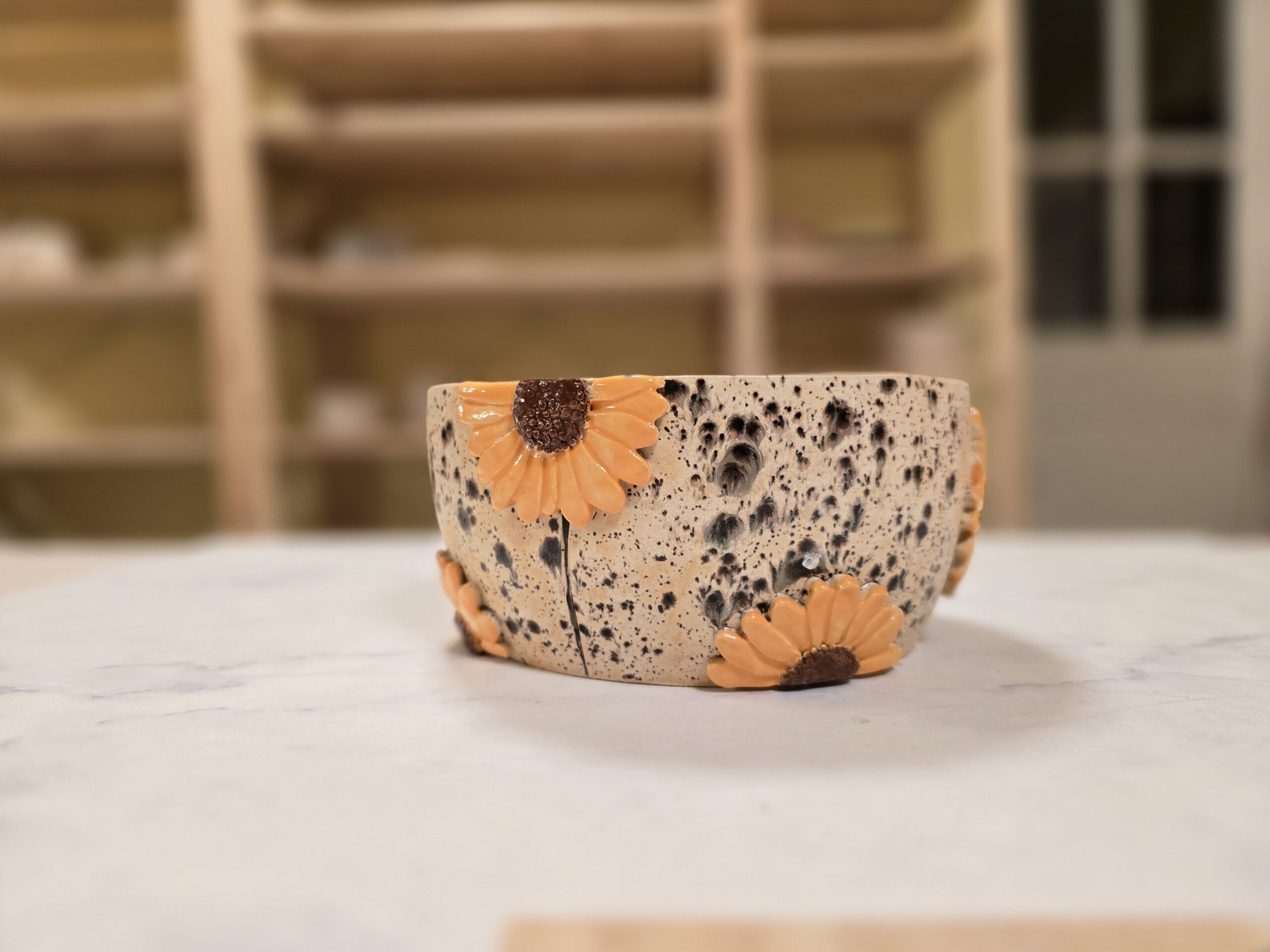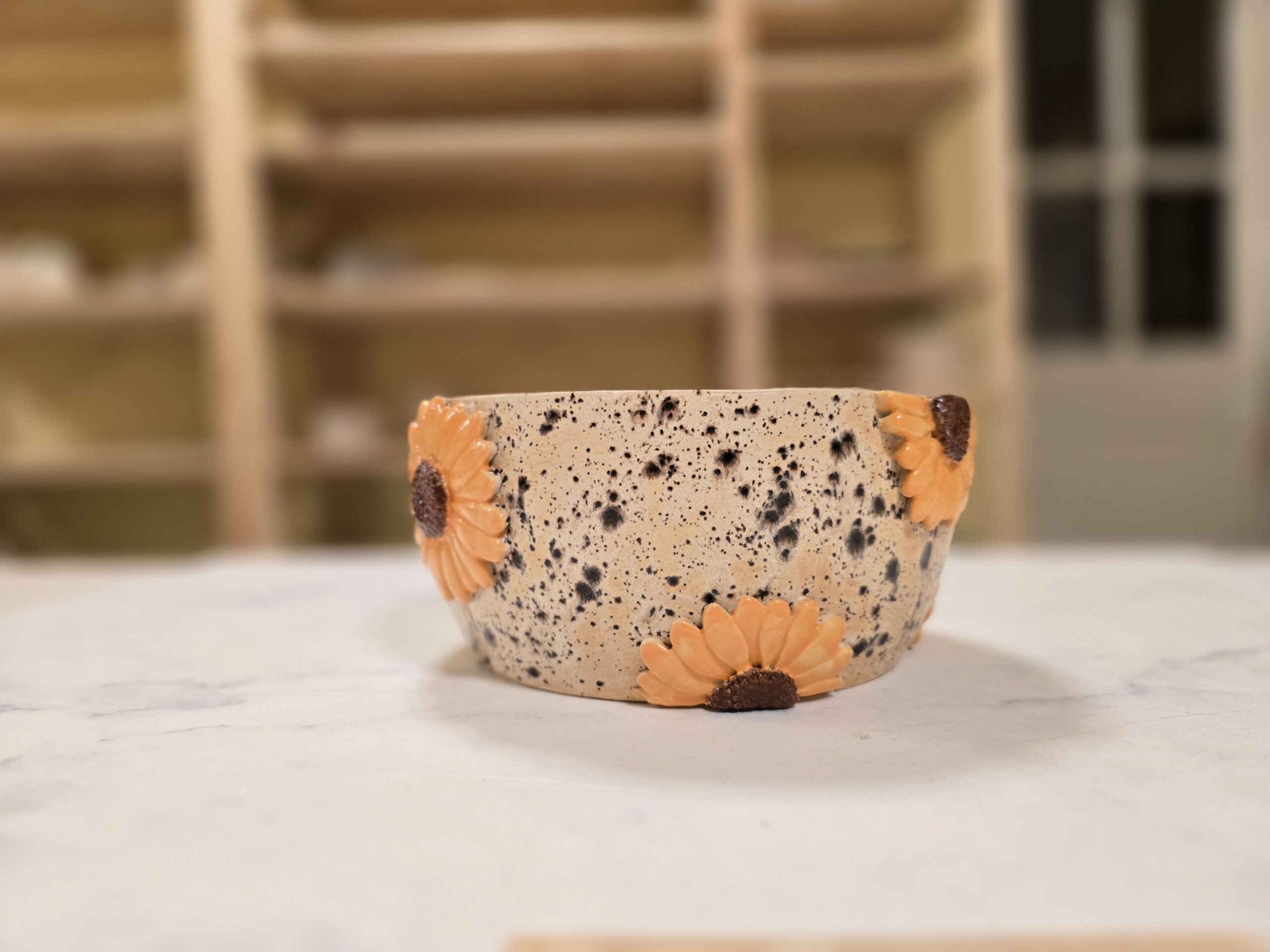 Denne håndlavede keramikskål er udført i stentøj med en varm, sandfarvet glasur og karakteristiske mørke prikker, der giver et levende og naturligt udtryk. Rundt om skålen blomstrer solsikker i varme orange og gyldne nuancer med dybe brune centre – et motiv, der skaber både varme og ro.