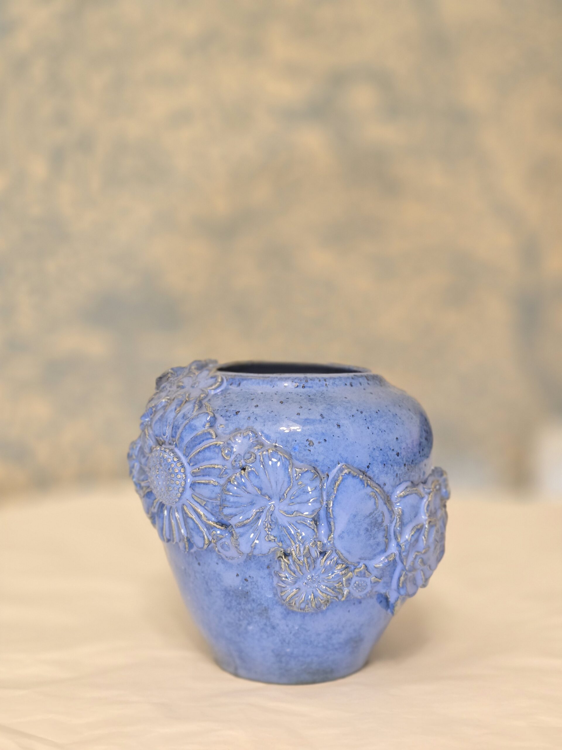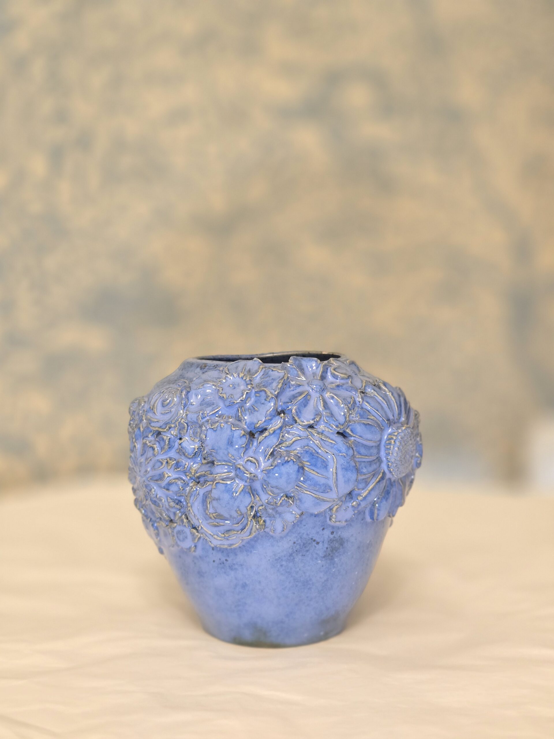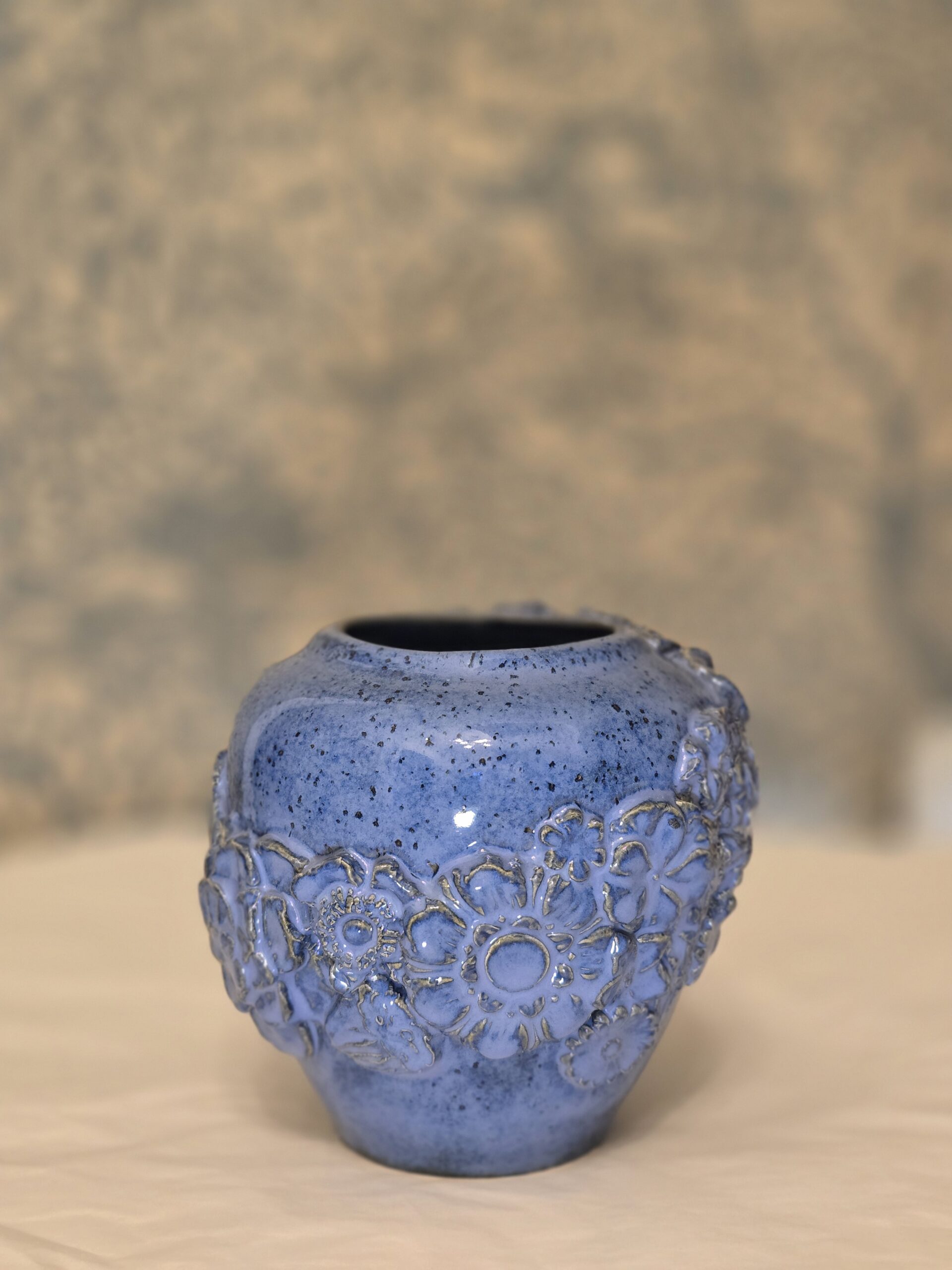 Oplev skønheden i denne charmerende vase, der måler 13 cm i højden. Med sin smukke blå farve tilføjer den et lyst og livligt præg til dit hjem. Vasen er prydet med detaljerede blomster, som skaber en smuk kontrast til den bløde farve.