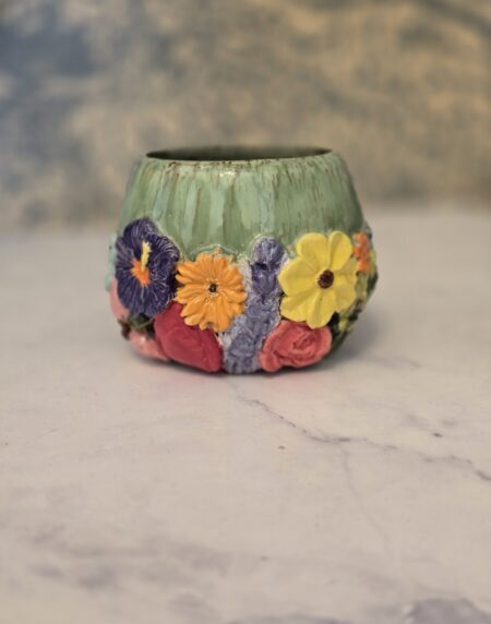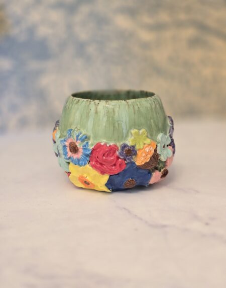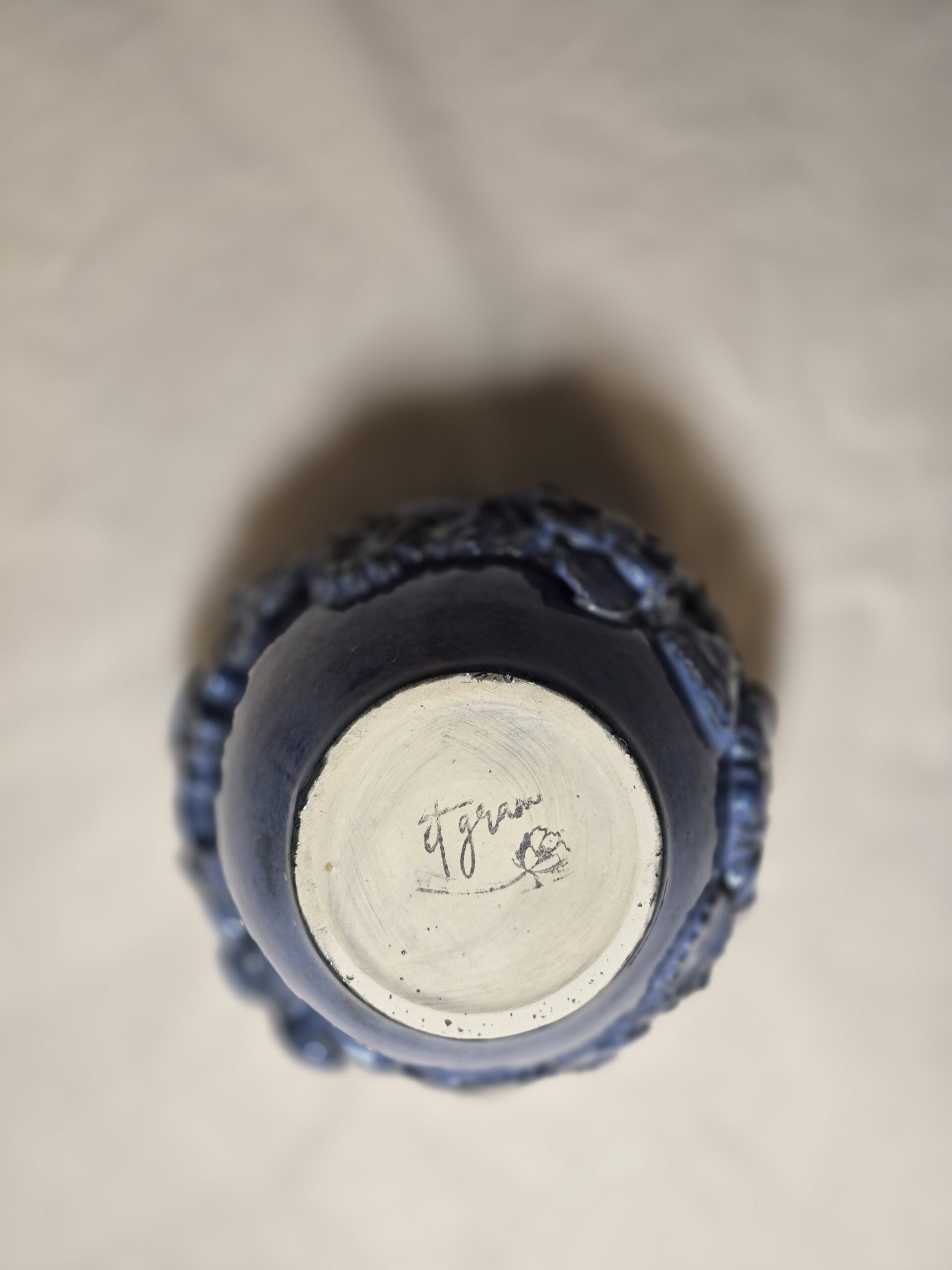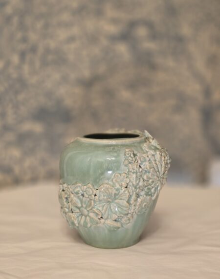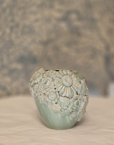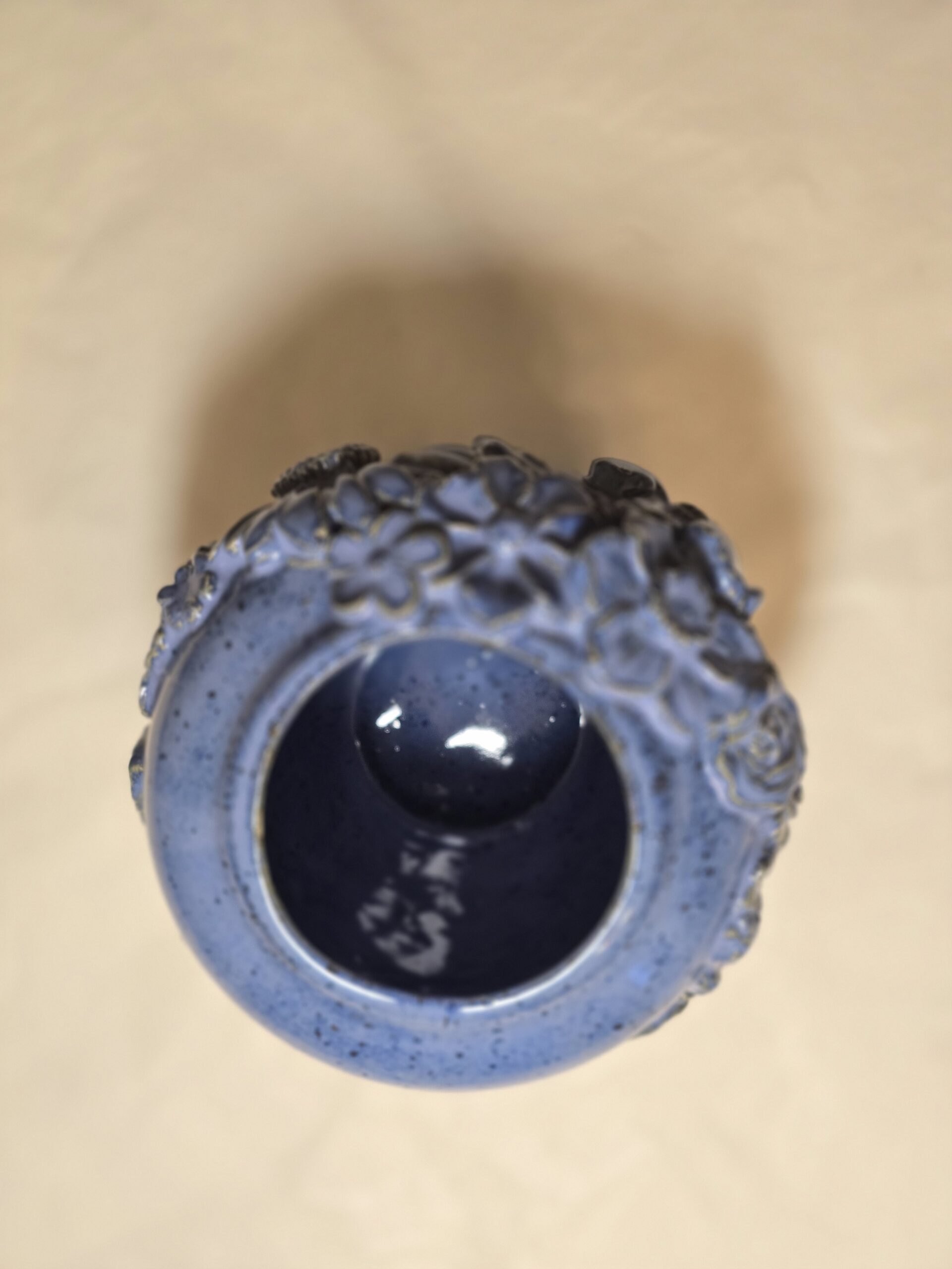Oplev skønheden i denne charmerende vase, der måler 13 cm i højden. Med sin smukke blå farve tilføjer den et lyst og livligt præg til dit hjem. Vasen er prydet med detaljerede blomster, som skaber en smuk kontrast til den bløde farve.