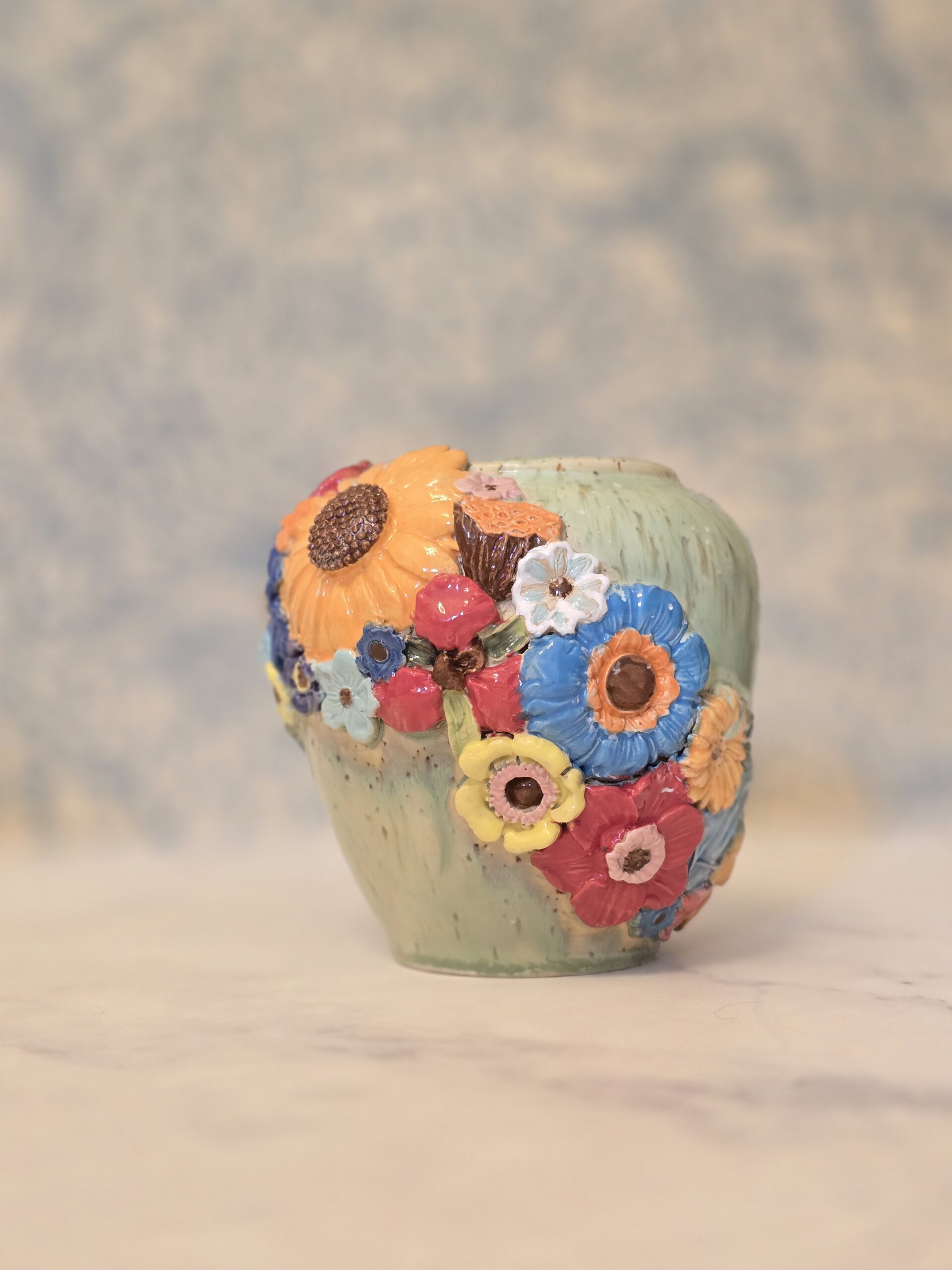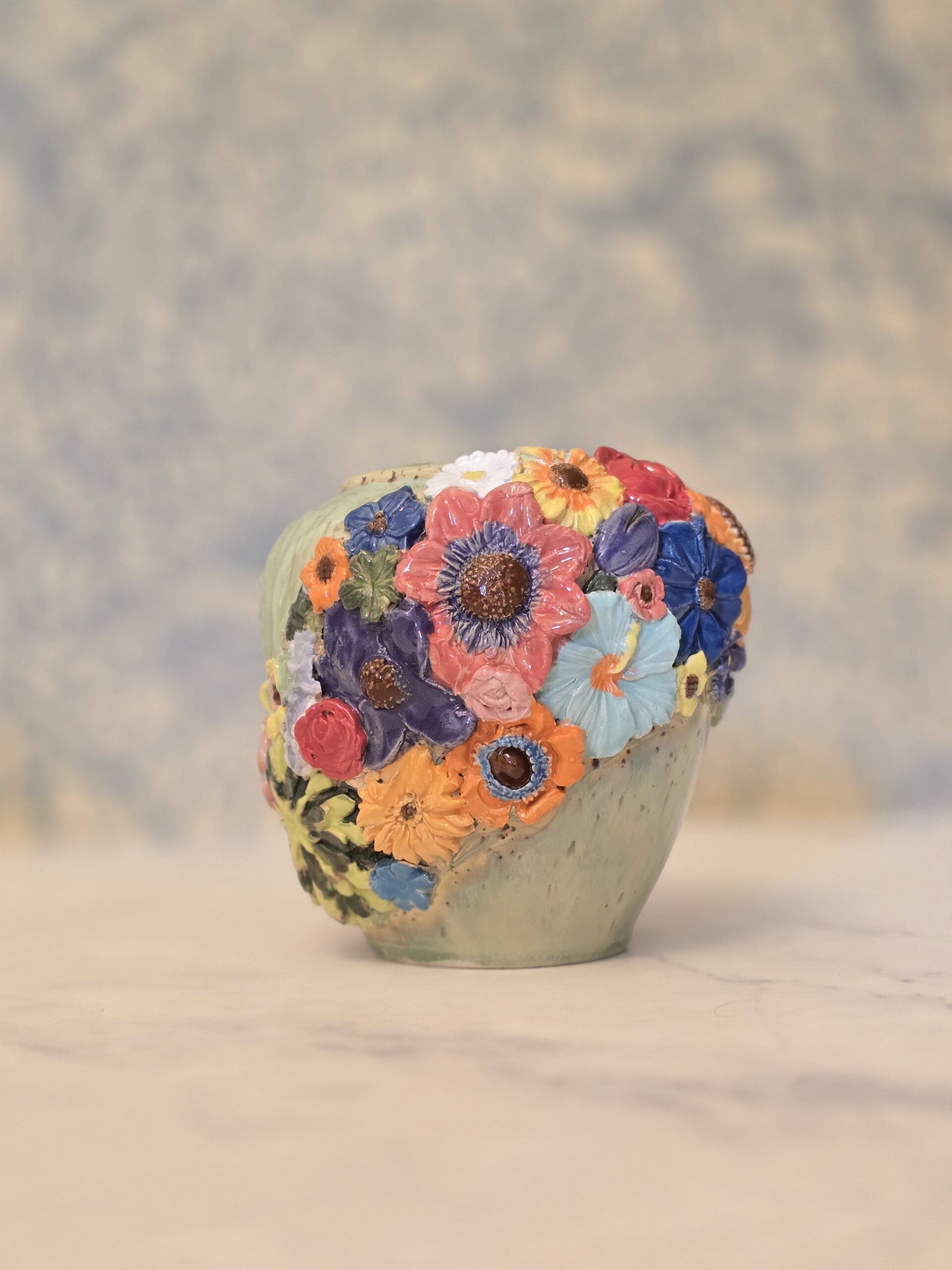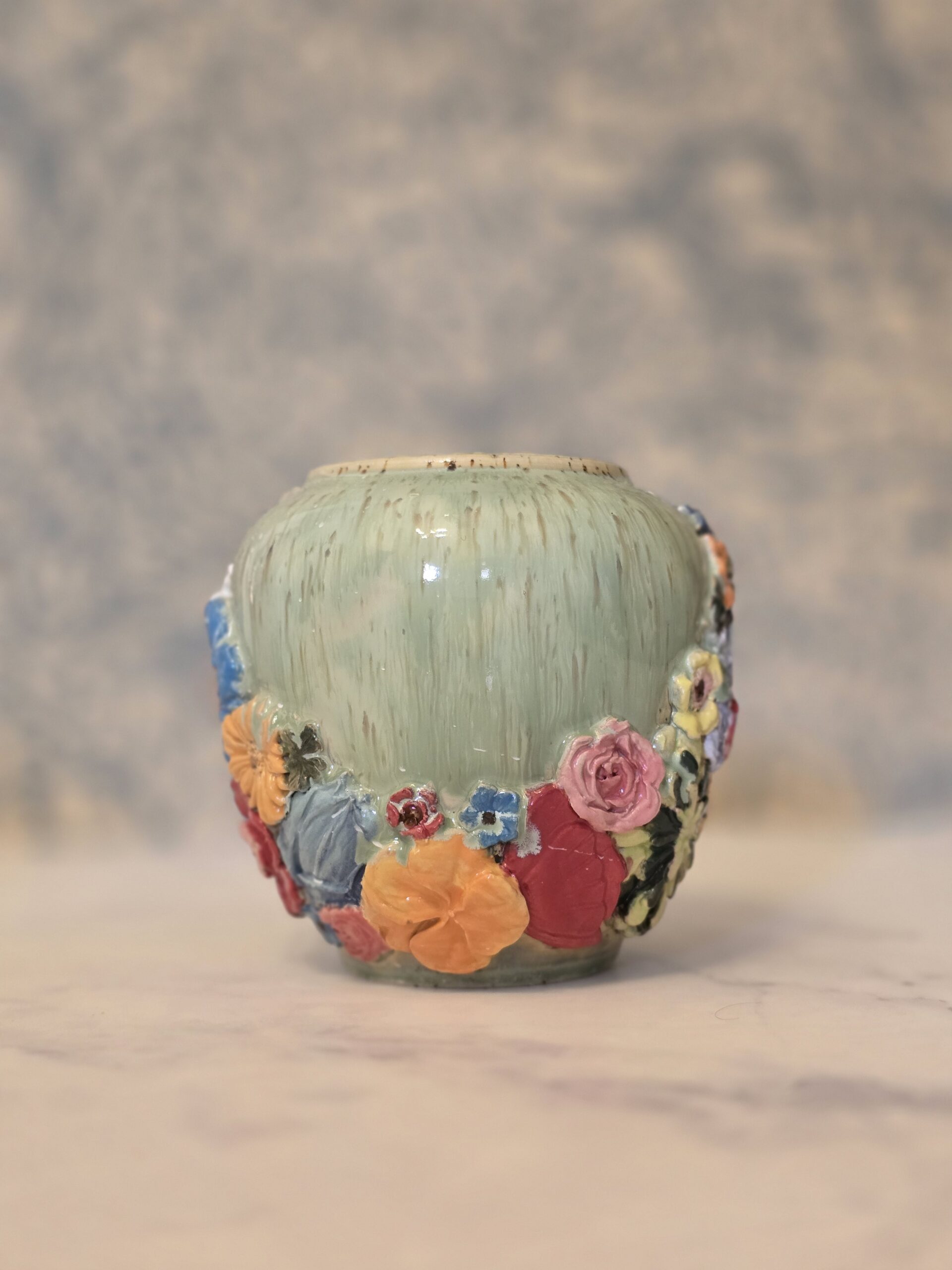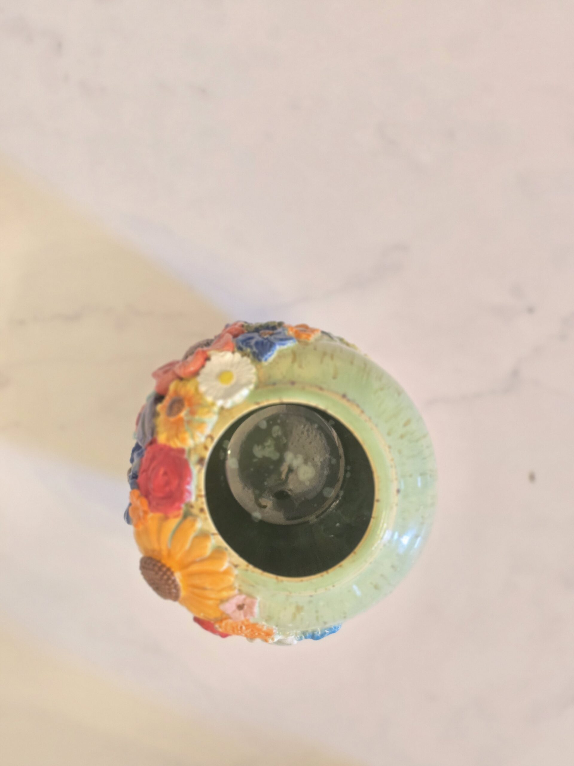 Vasen prydes af unikke lava pletter og er dekoreret med en række farverige blomster, der tilføjer liv og glæde til ethvert rum. Den bløde, grønne nuance kombineret med de farverige blomster gør den til et ideelt valg for enhver indretning, uanset om du bruger den til friske blomster, tørrede buketter eller som et dekorativt element.
