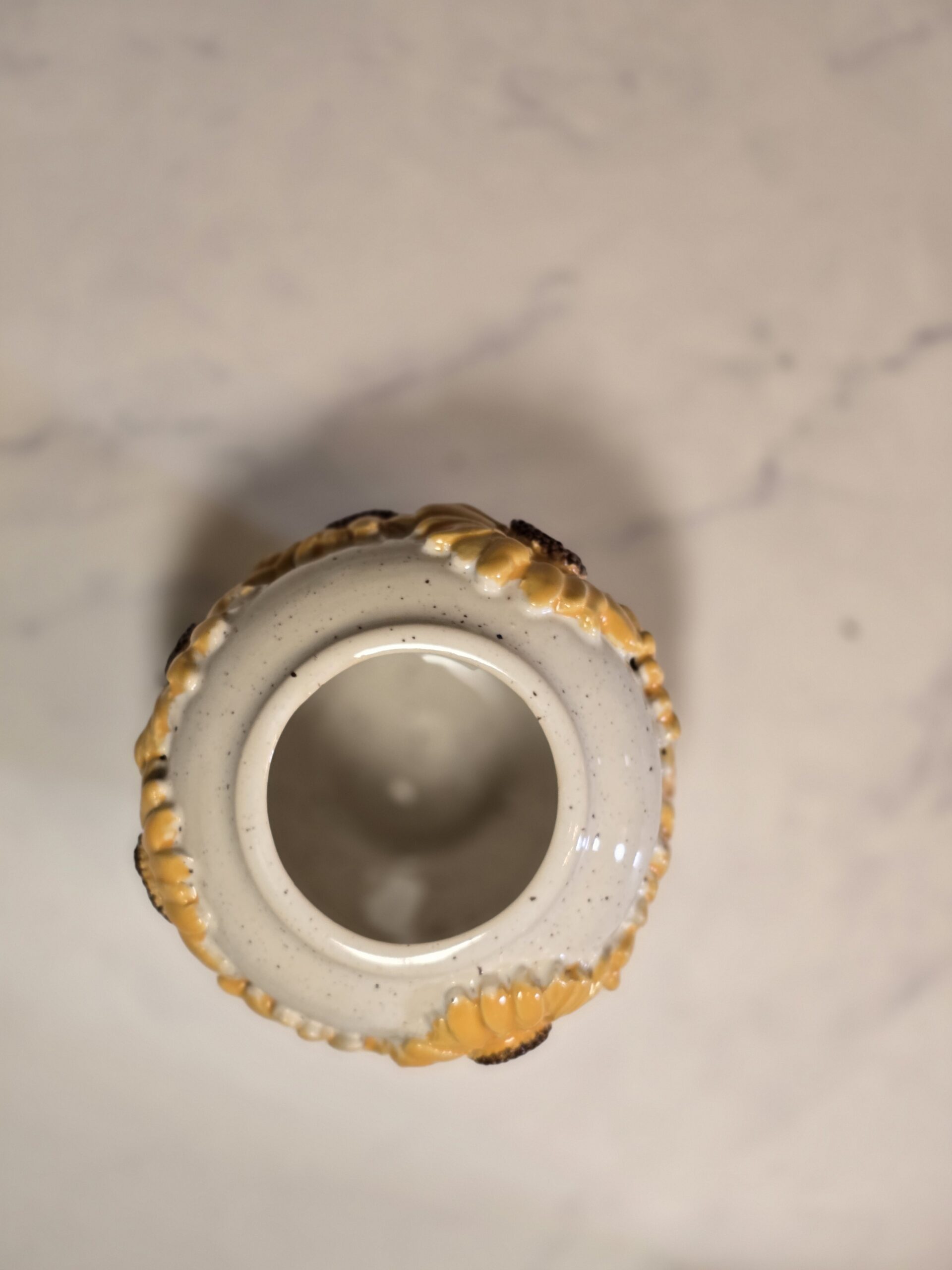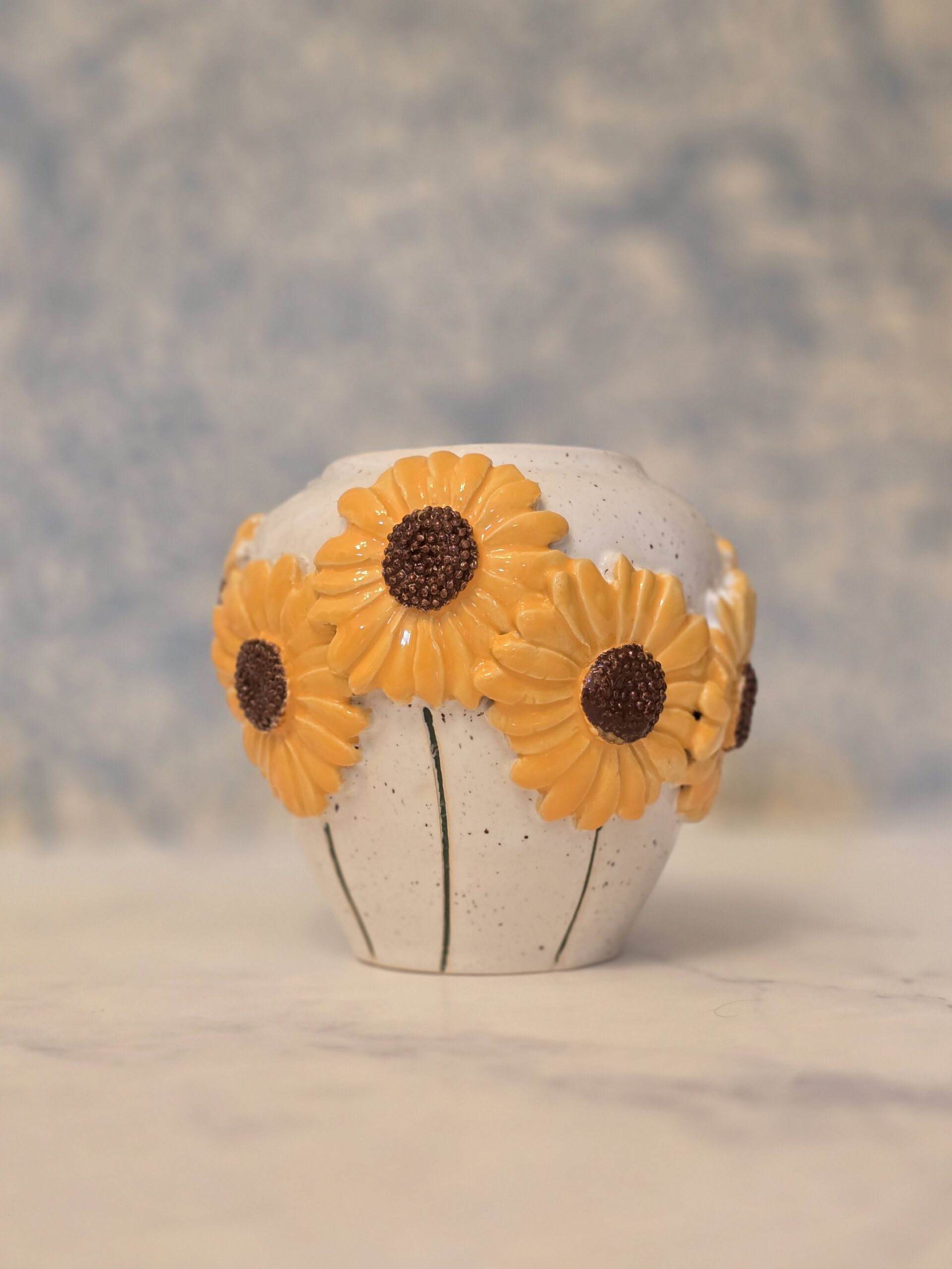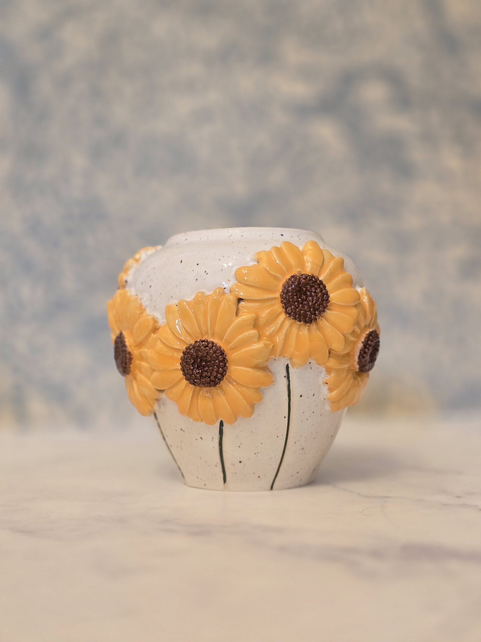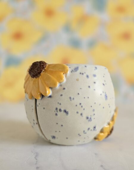 Skab en solrig og indbydende atmosfære i dit hjem med denne skønne vase, der prydes af udsøgte solsikker. Med en højde på 13 cm og fremstillet af stentøjsler, kombinerer den holdbarhed med et elegant design.